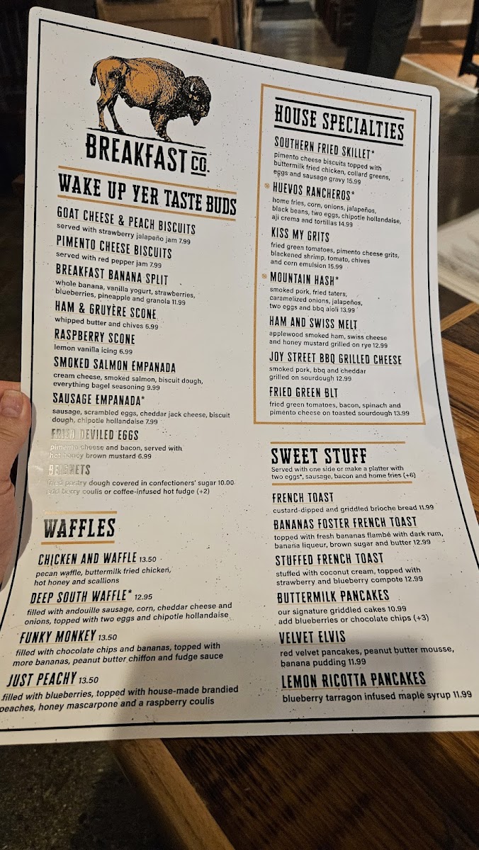 Nestled in the heart of Sevierville, TN, Buffalo Breakfast Co offers an eclectic breakfast experience destined to delight. Their menu shines with standout items like the Hot Honey Chicken and Waffles and the indulgent Deep South Waffle, featuring a hearty blend of andouille sausage and chipotle hollandaise. For those with a sweet tooth, the Funky Monkey Waffle and Bananas Foster French Toast promise a decadent treat.